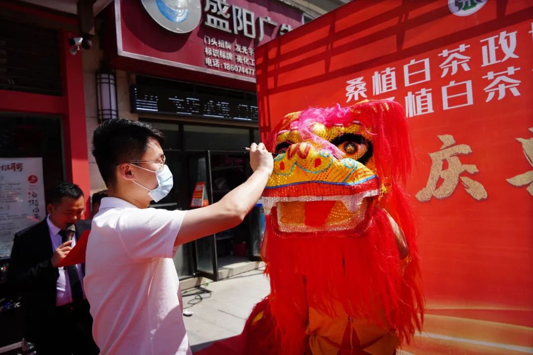 随后,一阵铿锵有力、热闹非凡的锣鼓响起,两头金狮在场上翻腾起舞,精彩的舞狮表演将现场的气氛推向了高潮,吸引了众多市民驻足观赏。李中钦先生与汤程霖先生一同为金狮点睛,寓意3044永利集团桑植白茶行政中心旗舰店鸿运当头,开业大吉。